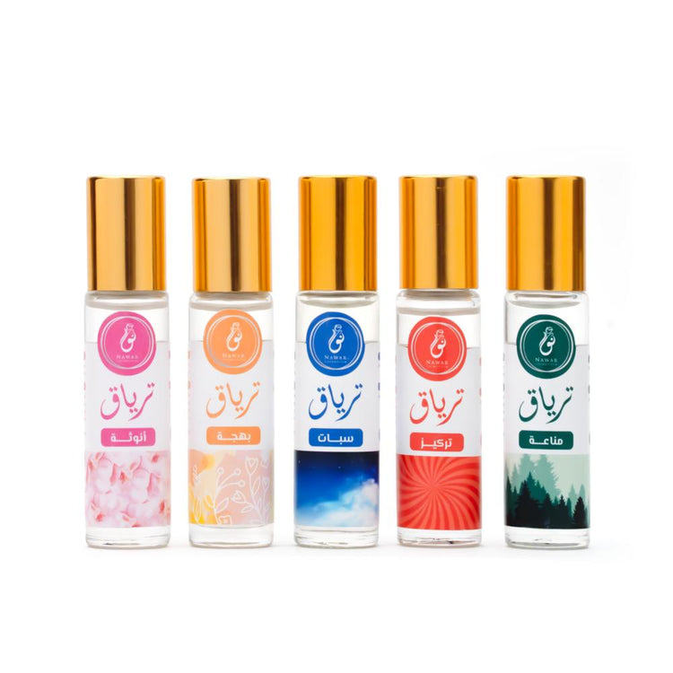 تشْكِيلةُ زُيُوتِنا العِطْريَّة في خَامةِ تِرْياقْ لها أثَرُ السِّحرِ عَلى مُخْتلَفِ الحَالاتِ النَّفسيَّة التي تَمُرِّينَ بها وسَتكُونُ حَلِيفَكِ الطَّبيعِي لتَعْديلِ المَزَاجِ
